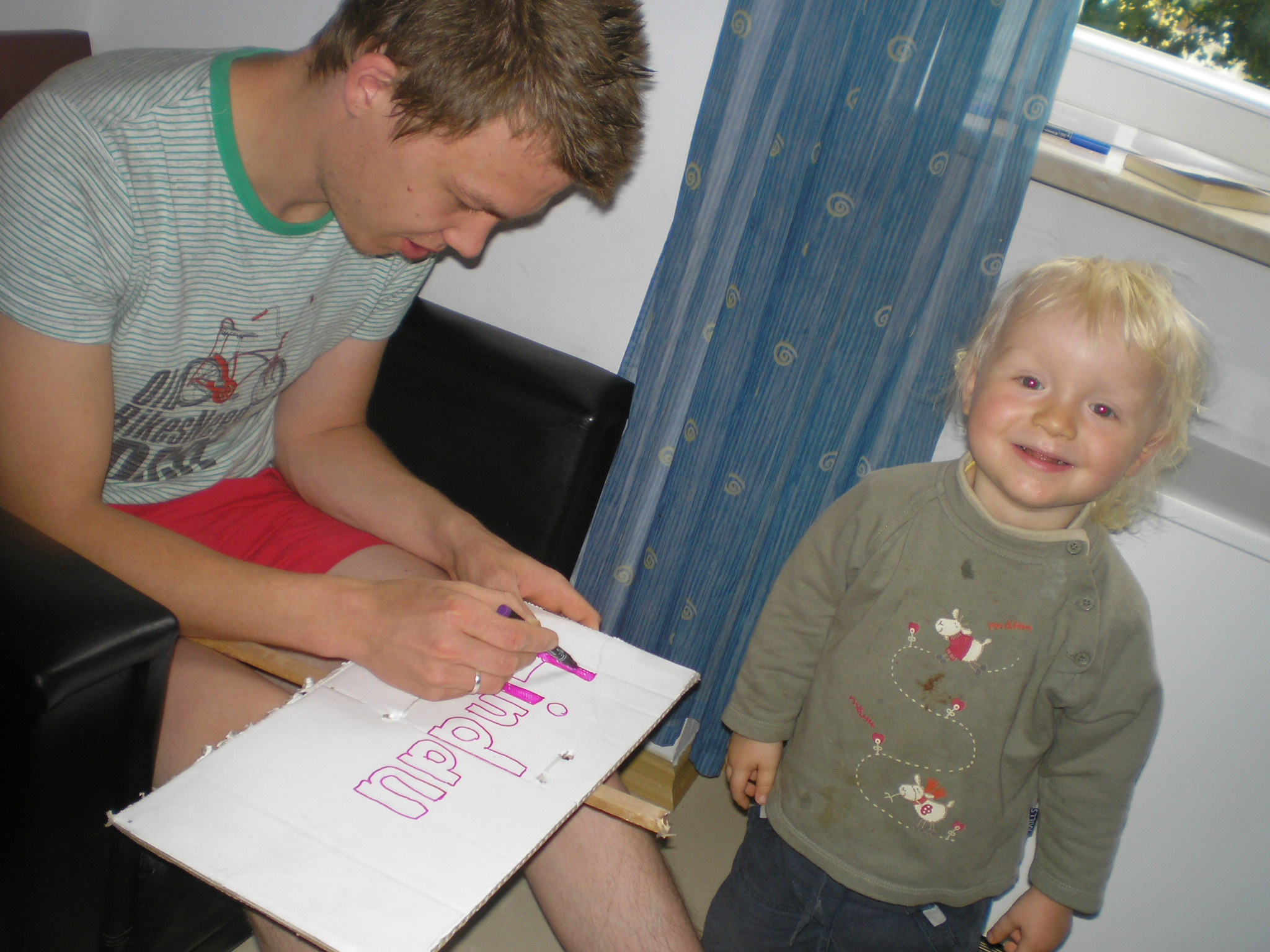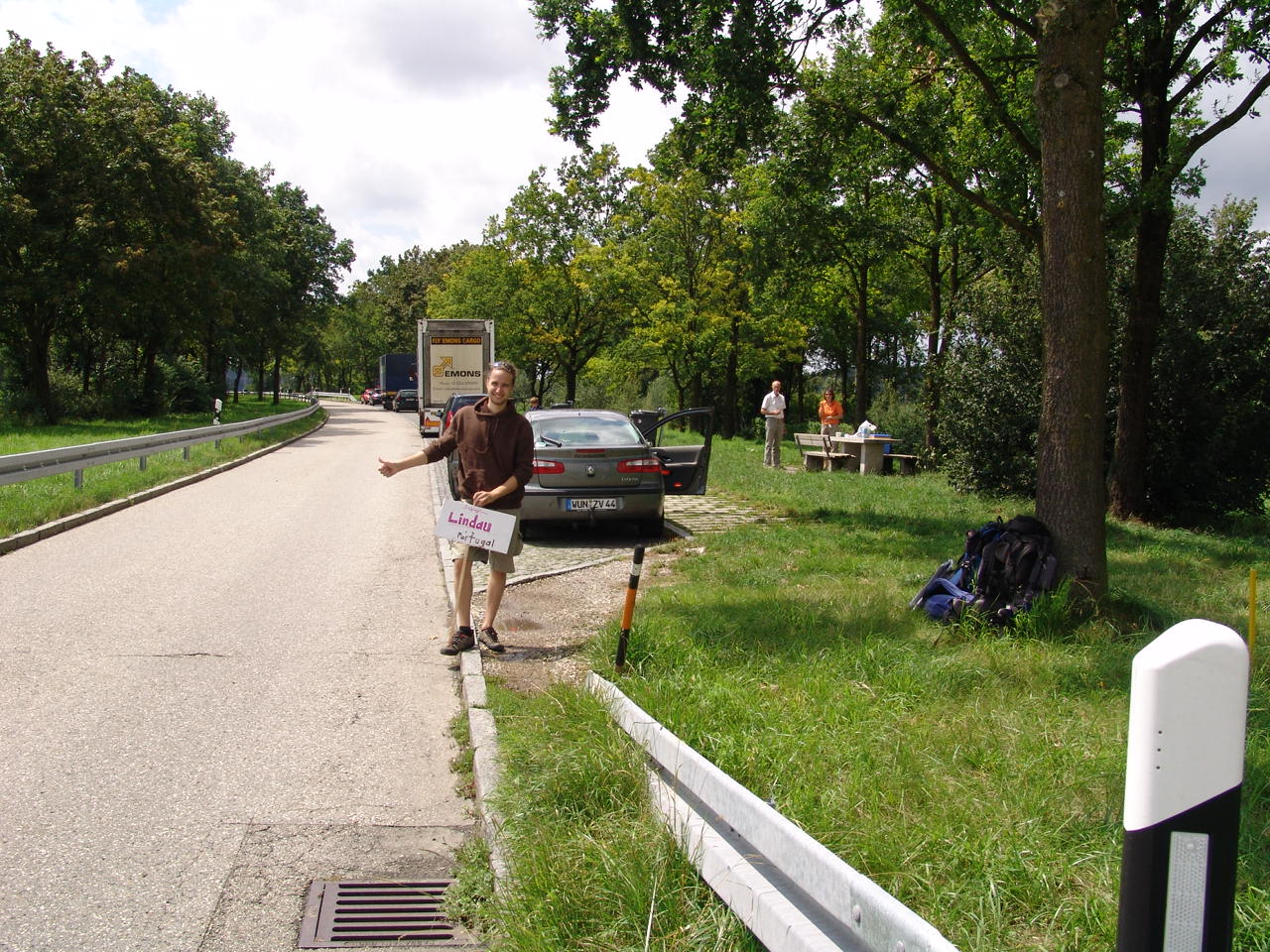 Ennyi mint bevezetés, a már érzékelhetően kusza de annál izgalmasabb új nap kezdetén, útban Svájcnak. Reggeli közben már érzékeljük a srác Sebi és a kisfiúk Lazar ténykedését körülöltünk, már épül a táblánk, vérprofi módon, és mert azt mondtuk megnézzük a közeli nagy tavat ezért mint úti cél nem volt nagy táv, de alatta kisbetűvel reicthag Portugal (remélem jól írtam, nem tudok németül csak tipp:) volt kiírva. Majd jön az újabb info, György ki a nap újabb Magyar meglepetése, ott lakott egy emelettel feljebb és már úton felénk, hogy minket kivigyen a legközelebbi benzinkúthoz vagy parkolóhoz, hogy tudjunk tovább stoppolni:D