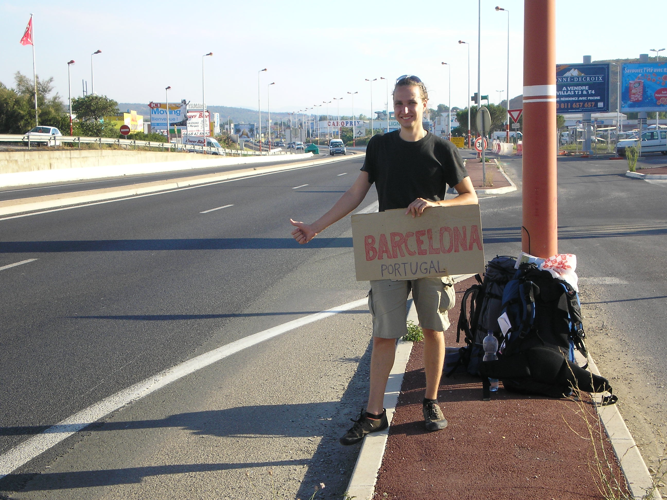 Itt gyártottunk egy Barcelona táblát, és stoppoltunk elég sokat, de nagyon gyér volt a forgalom, és a nap is ment le lassan. Ez azon ritka alkalmak egyike volt, amikor vagy három órát álltunk az út mellett. Néha ilyen is van. Úgy hallottuk, hogy Spanyolországban nem a legjobb a stopp. Talán ahogy haladunk délnek, annál nehezebb lesz...de úgy gondoltuk, hogy majd úgyis kiderül. Nem tudtuk, hogy pontosan hol vagyunk, de azt tudtuk, hogy már nagyon