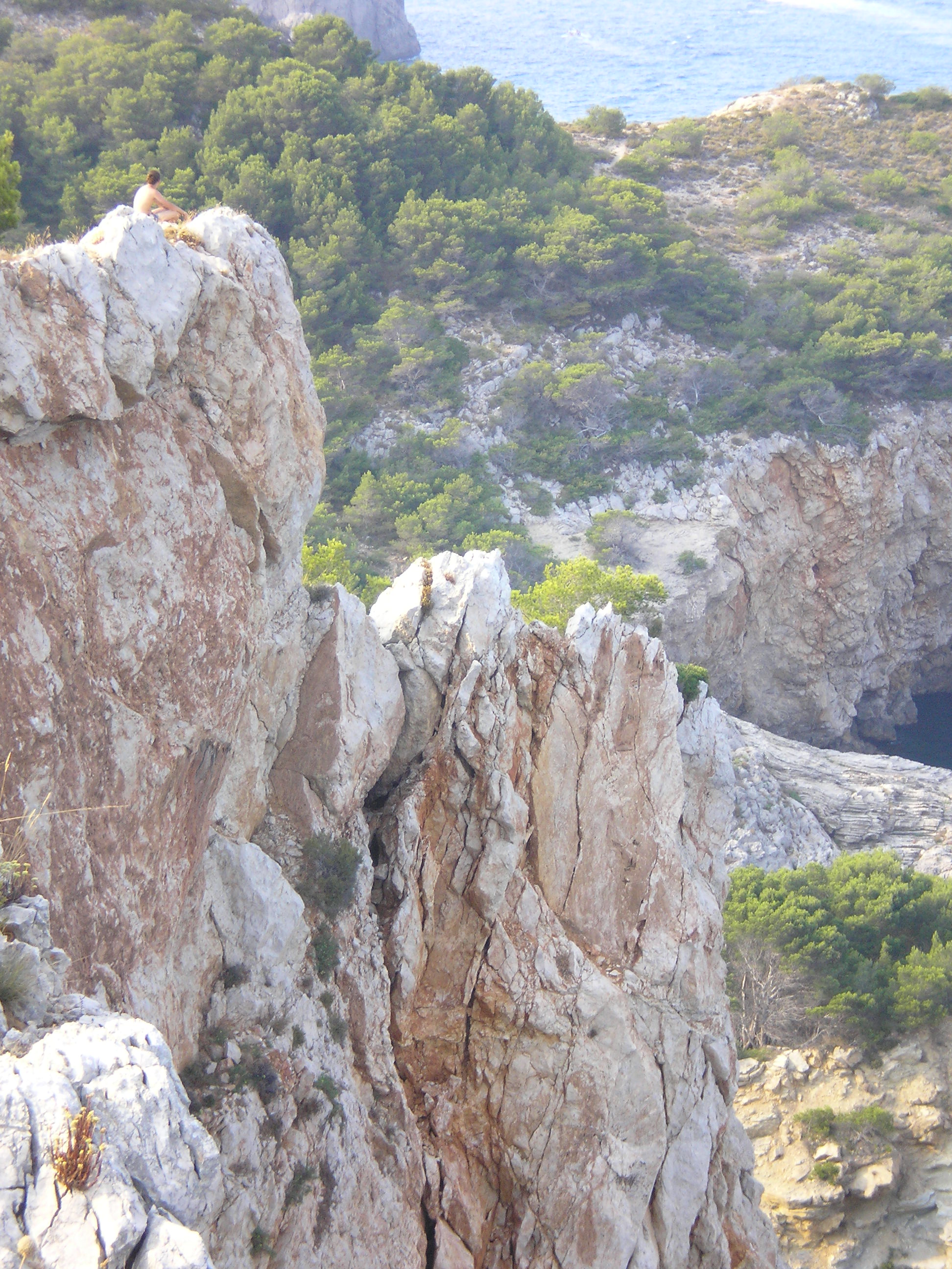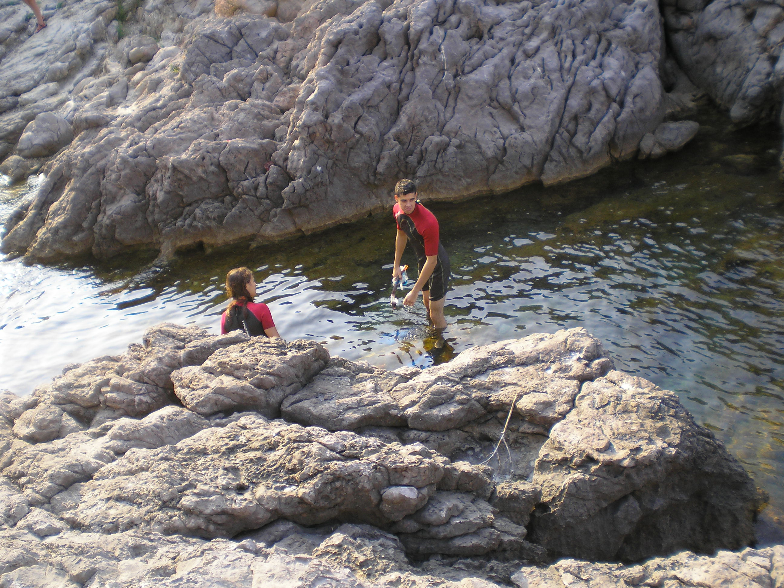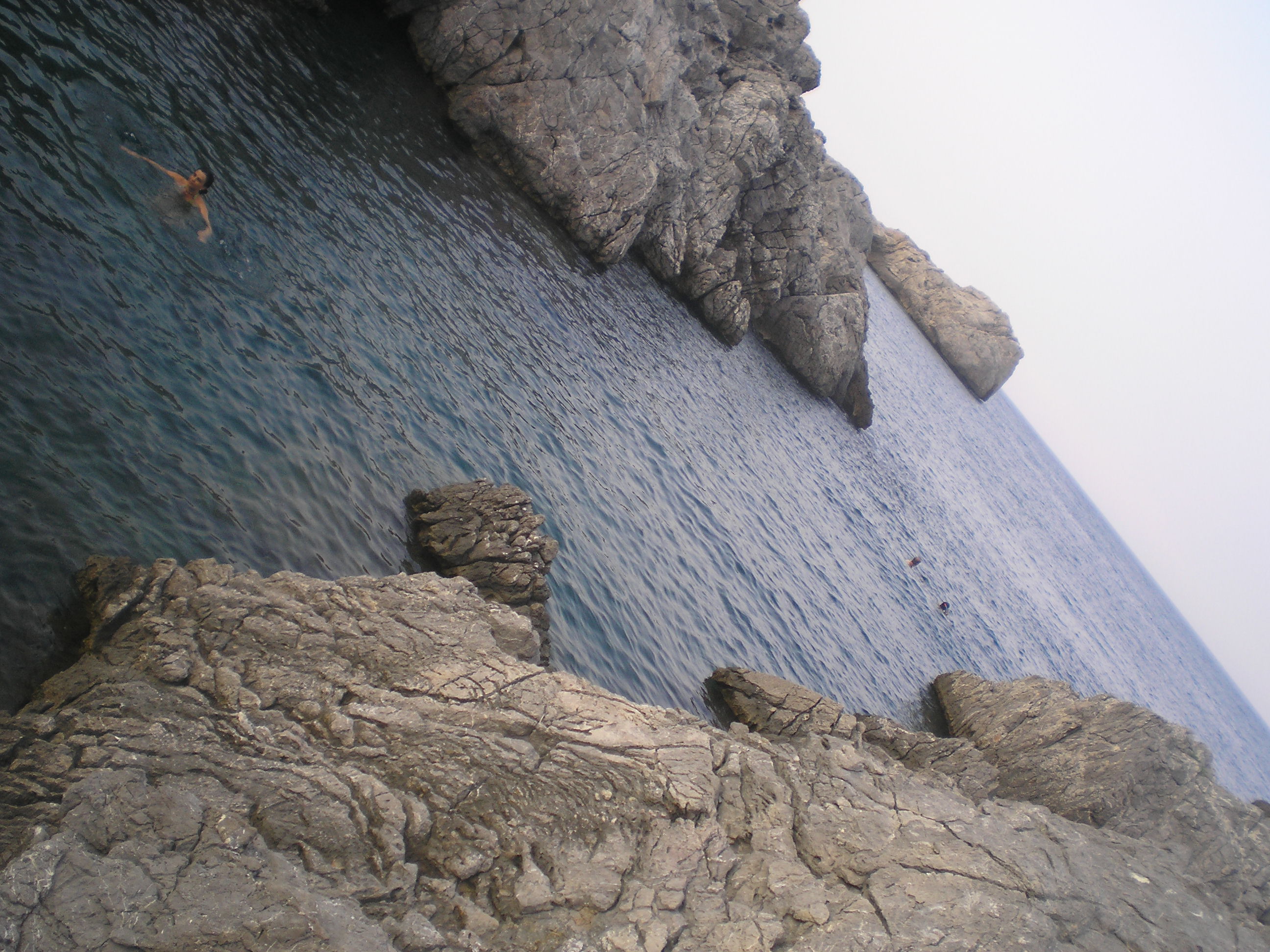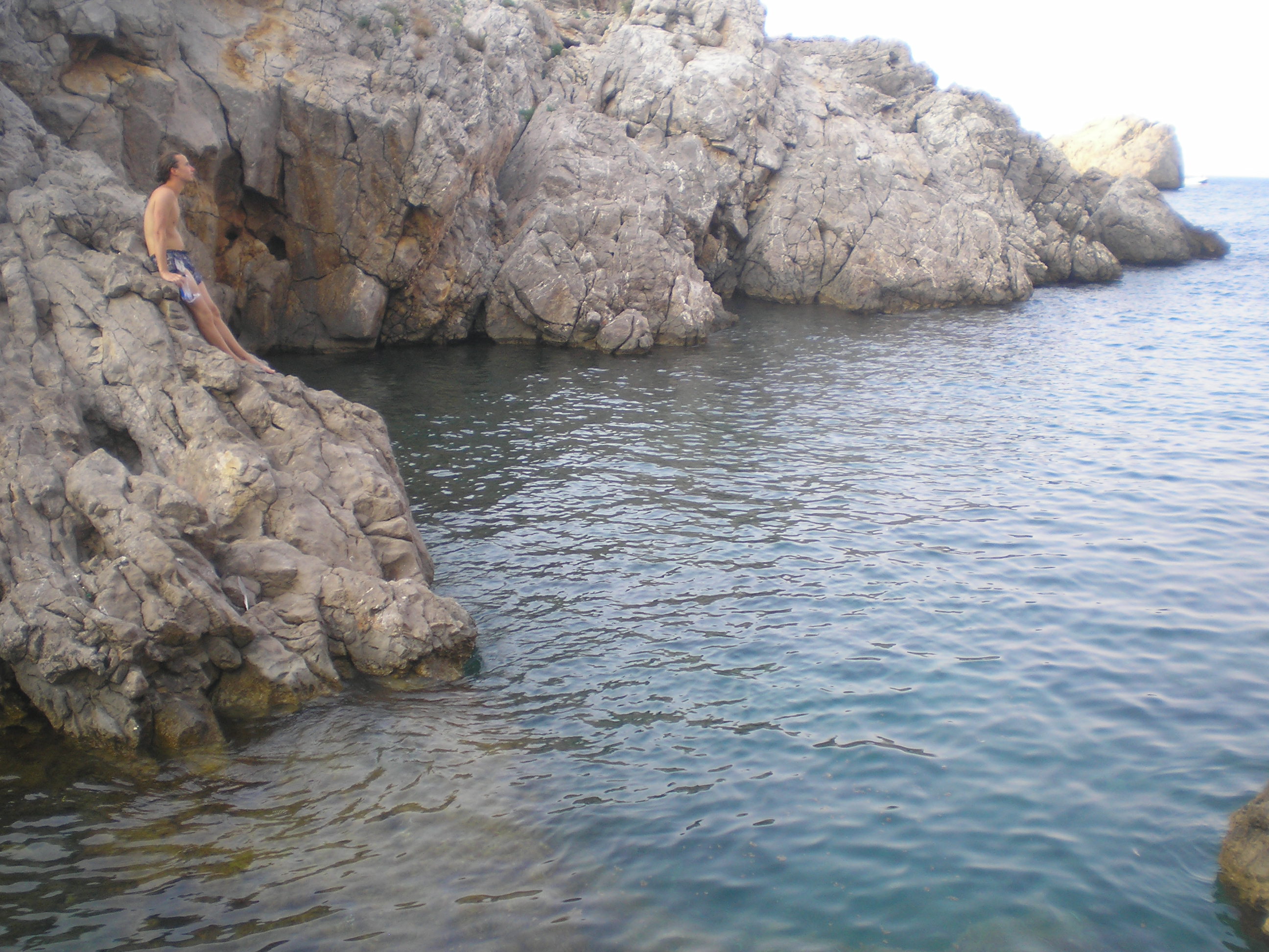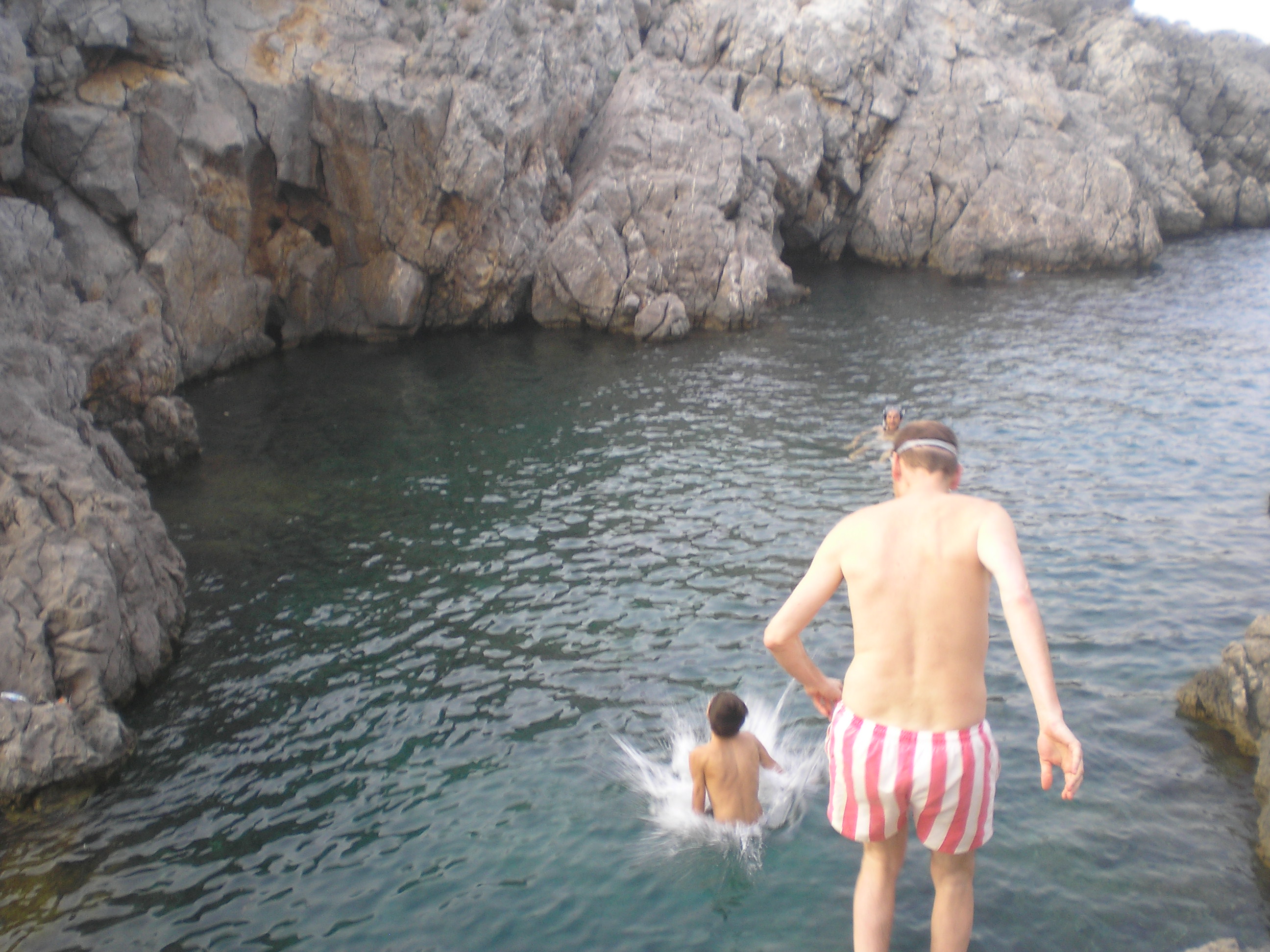 egy ideje hülyültünk ott, amikor jött egy spanyol család. Úgy láttam, ők nem akarnak a sziklákon bemászva szenvedni. Megkérdezték tőlünk (angolul), hogy hogyan a legegyszerűbb bejutni a vízbe? én meg mondtam félig viccesen, hogy hát be kell ugrani a szikláról... az apuka rákérdezett, hogy innen jó? És oda állt, ahonnan úgy véltük be lehet ugrani, csak ki tudja meddig megy le az ember a vízben, és azért jobb nem ráugrani egy tengeri sünre... mondtam, hogy "talán". Erre egymás után beugráltak. Nem szívbajosak ezek a spanyolok! Vagy csak tapsztaltak. Gyanítom nem most ugráltak be először tengerbe szikláról...