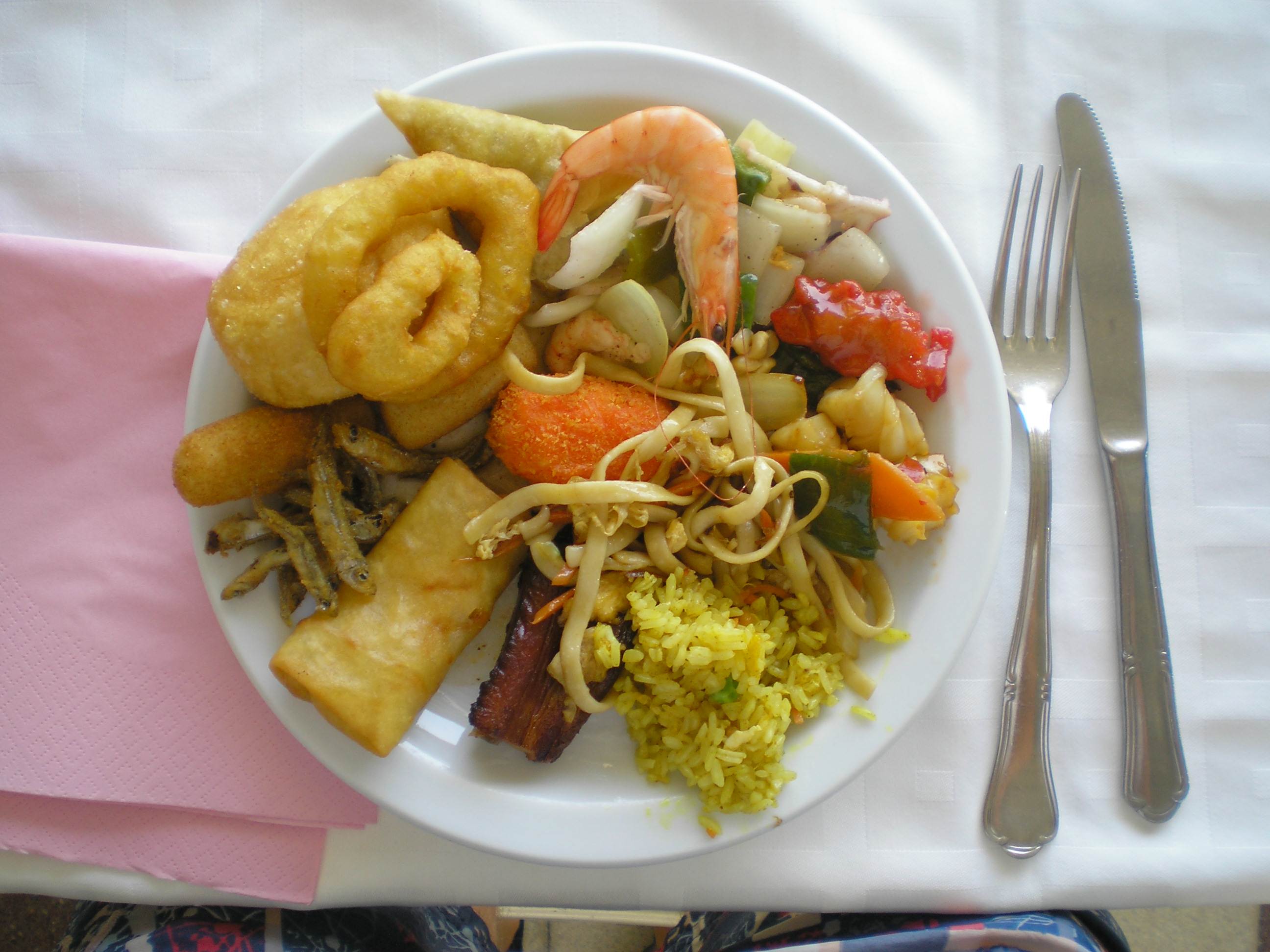 Mire kilubickoltuk magunkat, már farkaséhesek voltunk. Elindultunk hát a megfelelő helyre (a tegnapi körsétánkból már pontosan tudtuk, hova kell menni). Szóval magyarként bementünk egy svédasztalos kínai étterembe, Spanyolországban:) Csak hogy keveredjen minden. És hogy amúgy is keveredjen minden, a tésztát kivéve mindenből szedtünk...